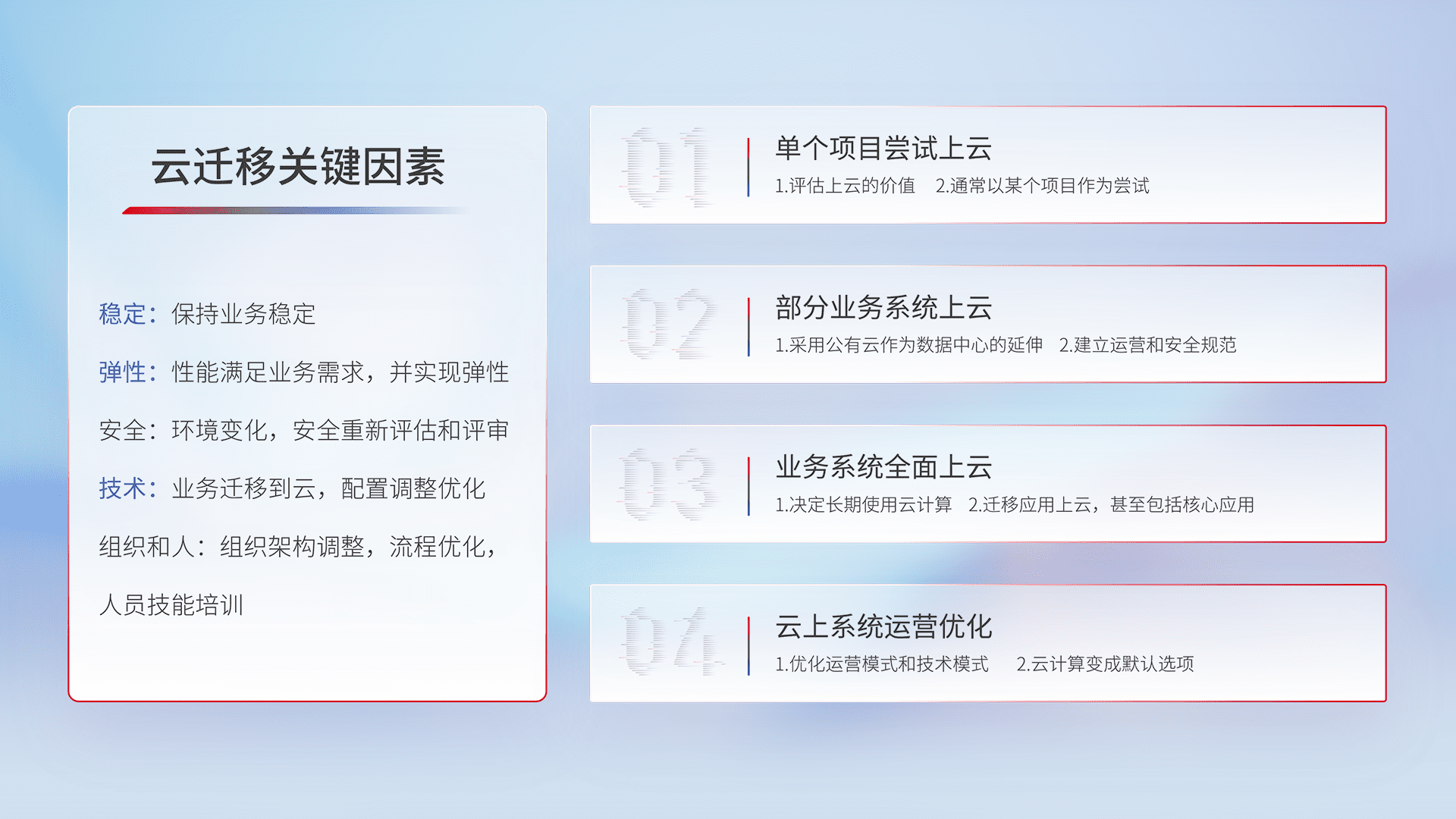 结合实际业务,,,从规划设计、、云平台选型、、云原生改造、、、、数据迁移、、、、集成交付,,迁移全过程为客户识别最佳上云路径,,,做好风险识别管理,,设计网络架构、、身份权限、、、安全审计合规、、、操作审计、、、、日志审计、、、、监控告警策略、、、、多站点容灾设计等,,对云上基础设施进行整体规划,,提升IT治理水平,,以满足弹性、、、、高可用、、、、高性能的需求。。。。